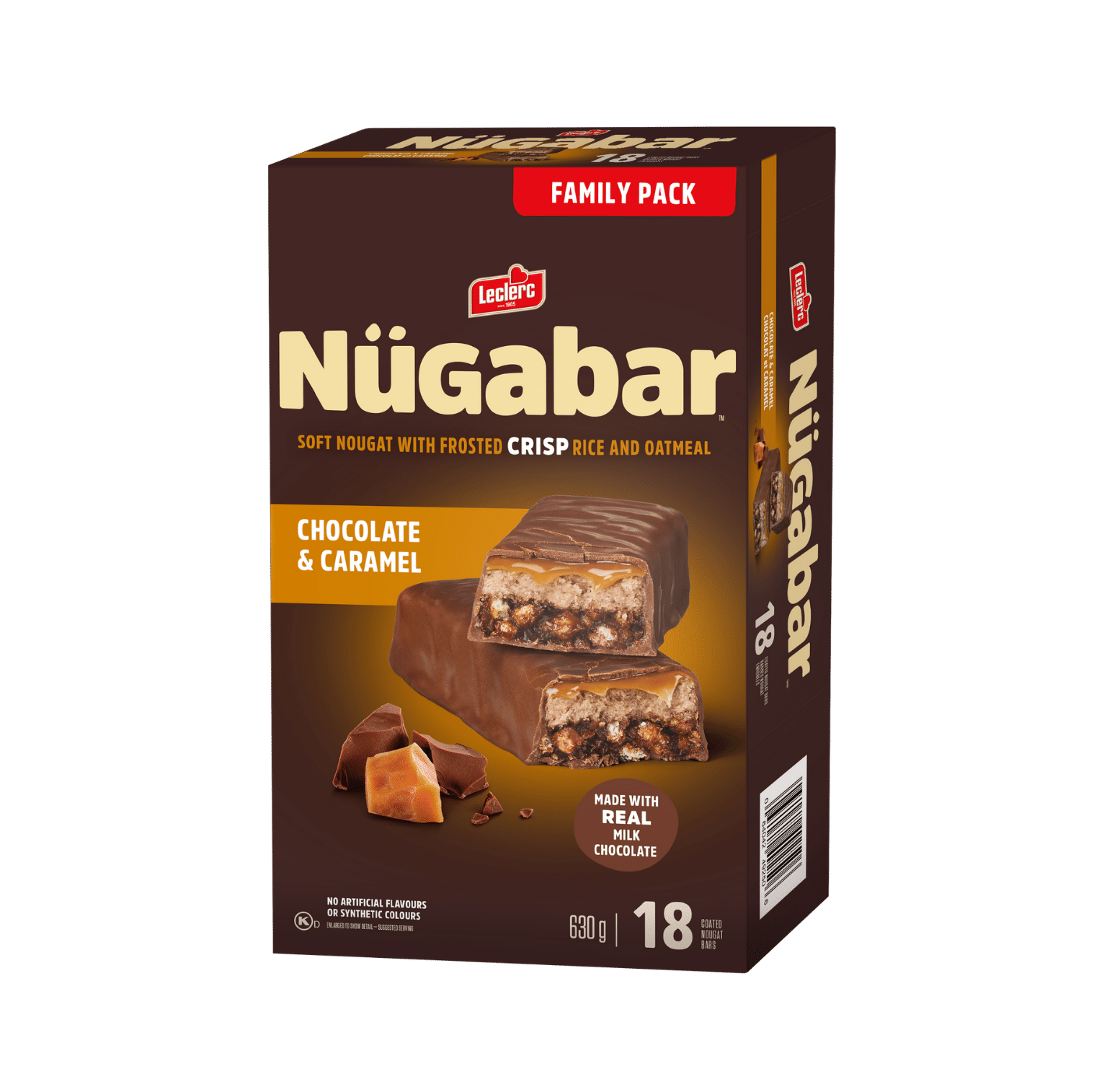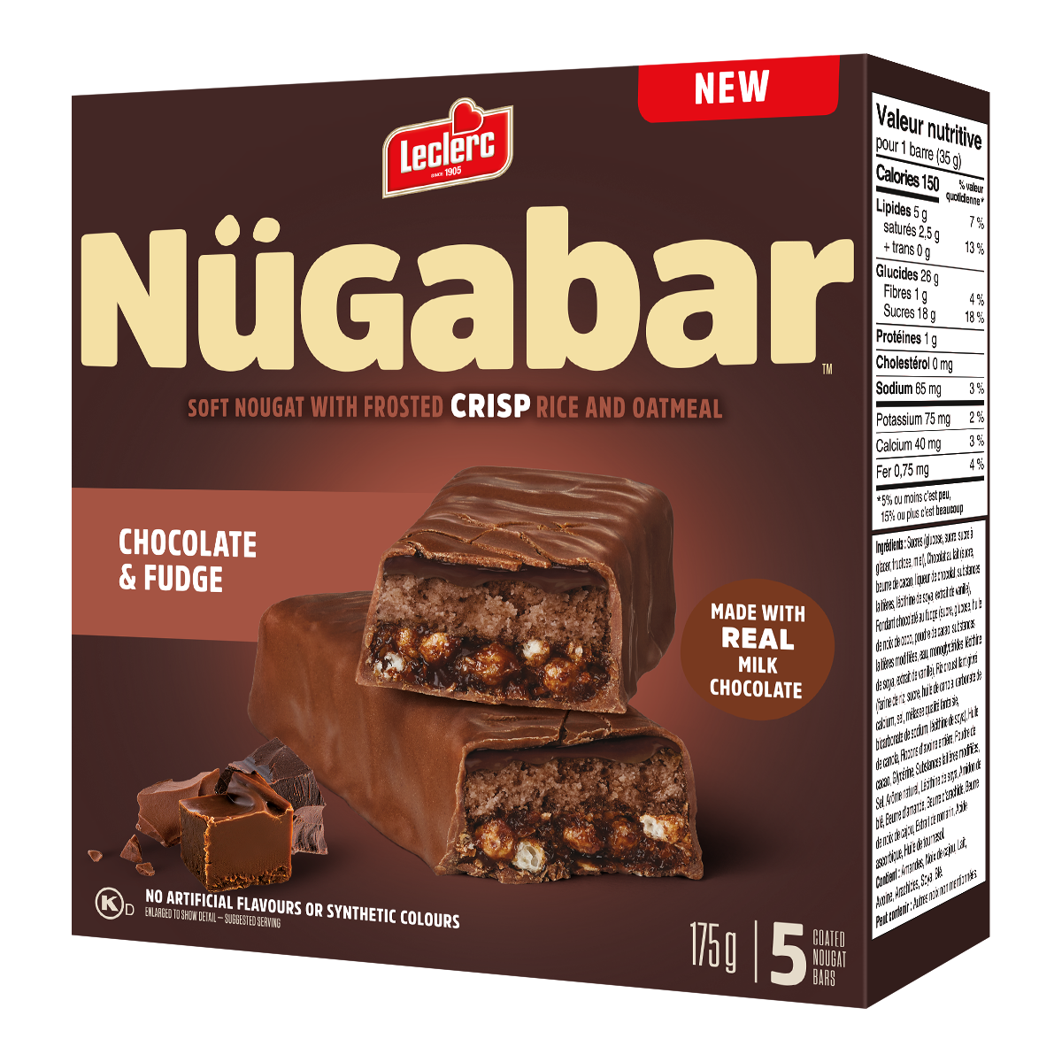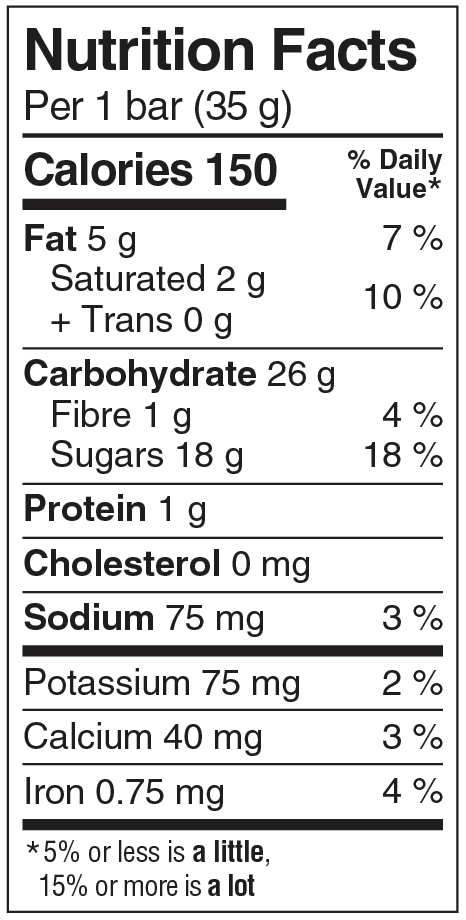 Sugars (glucose, sugar, icing sugar, fructose, honey, dry malt extract [barley]), Milk chocolate (sugar, cocoa butter, chocolate liquor, milk ingredients, soya lecithin, vanilla extract), Frosted crisp rice (rice flour, sugar, canola oil, calcium carbonate, salt, fancy molasses, sodium bicarbonate, soya lecithin), Canola oil, Whole rolled oats, Chocolate cookie crumbs (enriched wheat flour, sugar, cocoa powder, palm oil, glucose, sodium bicarbonate, salt, natural flavour, milk ingredients), Glycerin, Modified milk ingredients, Cocoa powder, Wheat starch, Natural flavour, Salt, Soya lecithin, Almond butter, Peanut butter, Cashew butter, Sunflower oil.