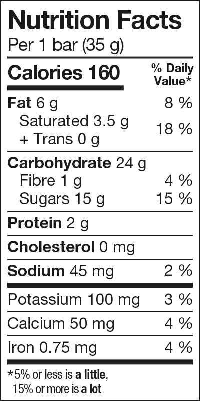 Milk chocolate (sugar, cocoa butter, chocolate liquor, milk ingredients, soya lecithin, vanilla extract), Sugars (glucose, sugar, fructose, honey, fancy molasses), Chocolatey fudge fondant (sugar, glucose, coconut oil, cocoa powder, modified milk ingredients, water, monoglycerides, soya lecithin, vanilla extract), Rice flour, Whole rolled oats, Canola oil, Chocolate chips (sugar, chocolate liquor, cocoa butter, soya lecithin, salt, vanilla extract), Glycerin, Cocoa powder, Wheat flakes, Calcium carbonate, Salt, Artificial flavour, Soya lecithin, Rosemary extract, Ascorbic acid.