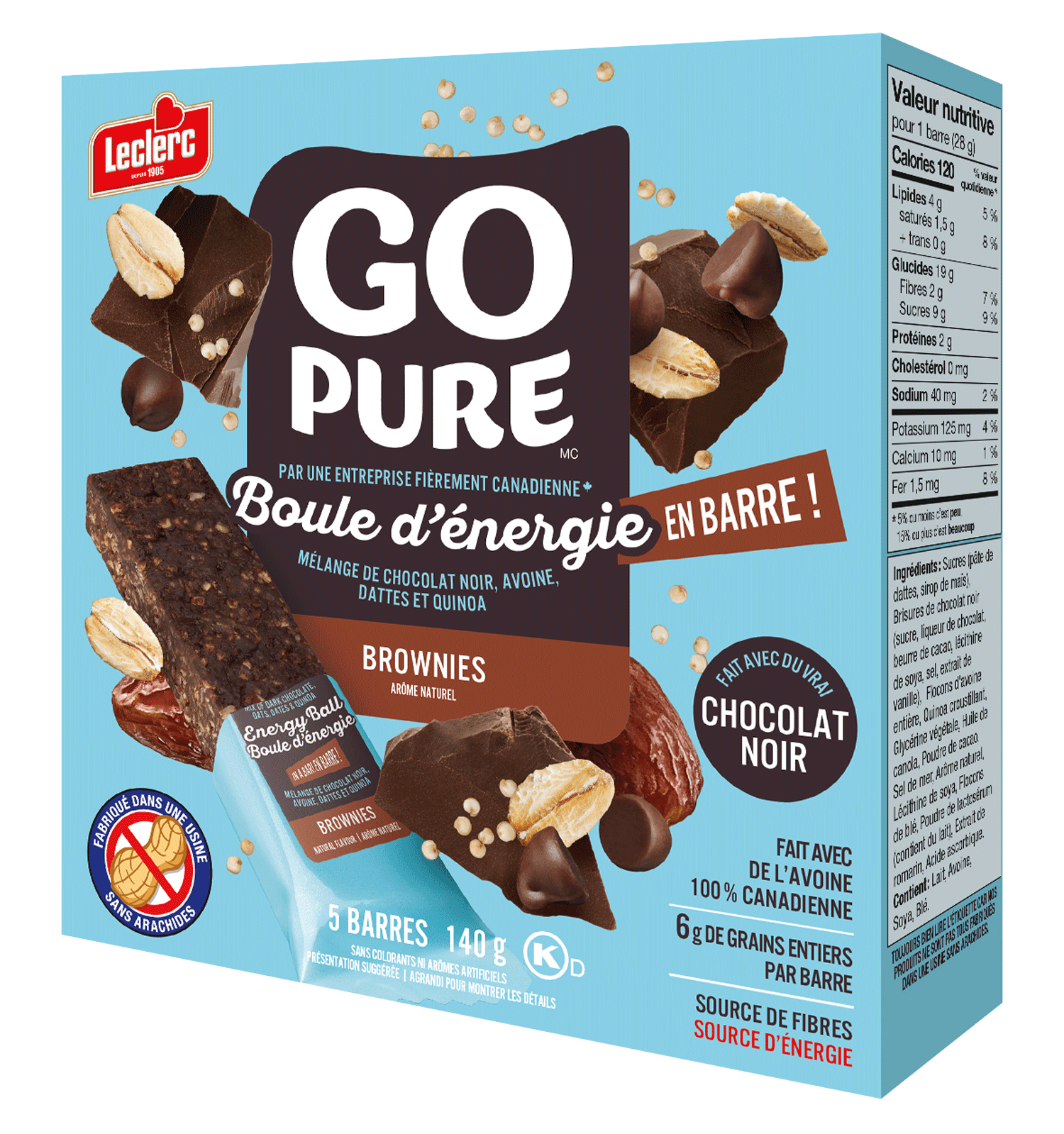 Sugars (date paste, corn syrup, fructose, honey) • Chocolate (sugar, chocolate liquor, cocoa butter, soya lecithin, vanilla extract, milk ingredients) • Whole rolled oats • Chocolate chips (sugar, chocolate liquor, cocoa butter, soya lecithin, salt, vanilla extract) • Crisped quinoa • Cocoa powder • Vegetable glycerin • Sea salt • Natural flavour • Soya lecithin • Salt • Wheat flakes