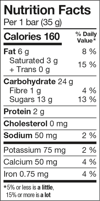Milk chocolate (sugar, cocoa butter, chocolate liquor, milk ingredients, soya lecithin, vanilla extract), Sugars (glucose, sugar, fructose, honey, fancy molasses), Whole rolled oats, Rice flour, Chocolate chips (sugar, chocolate liquor, cocoa butter, soya lecithin, salt, vanilla extract), Canola oil, Wheat flakes, Glycerin, Dried unsweetened coconut, Salt, Calcium carbonate, Natural flavour, Soya lecithin, Rosemary extract, Ascorbic acid.