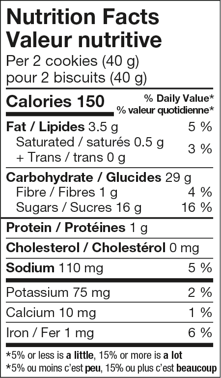 Cookie (enriched wheat flour, sugar, canola oil, mono and diglycerides, fancy molasses, sodium bicarbonate, salt, soya lecithin, natural flavour, modified milk ingredients, tartrazine and sunset yellow FCF and allura red), Apple filling (apple puree, glucose, sugar, glucose-fructose, pectin, citric acid, potassium sorbate, allura red). Contains: Milk, Soya, Wheat.