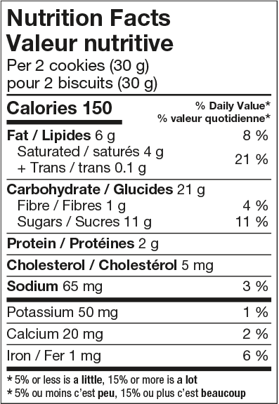 Chocolat au lait (sucre, beurre de cacao, liqueur de chocolat, substances laitières, lécithine de soya, vanilline), Farine de blé enrichie, Sucre, Beurre, Bicarbonate de sodium, Sel, Arôme artificiel, Lécithine de soya.