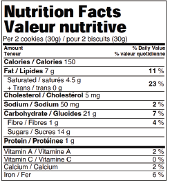 Chocolat au lait (sucre, beurre de cacao, liqueur de chocolat, substances laitières, lécithine de soya, vanilline), Farine de blé enrichie, Garniture au caramel (glucose, cassonade, sucre, huile de noix de coco et/ou de soya hydrogénée, eau, substances laitières modifiées, sel, arôme artificiel, lécithine de soya), Sucre, Beurre (lait), Sel, Bicarbonate de sodium, Lécithine de soya, Arôme artificiel.