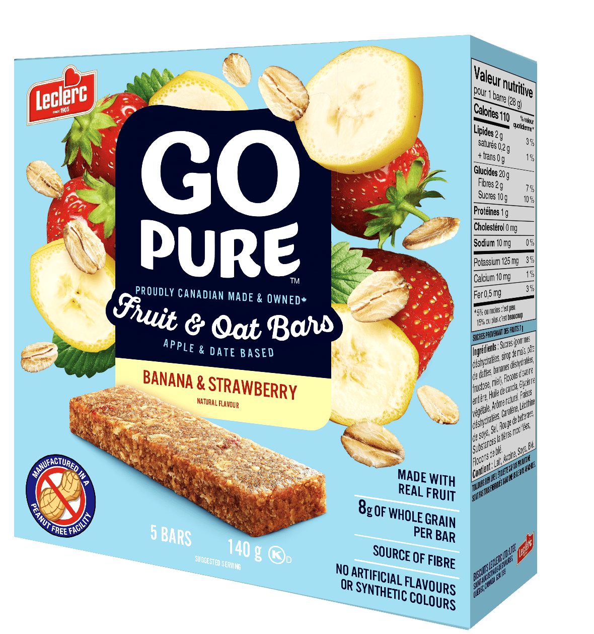 Le goût savoureux des bananes et fraises bien mélangé avec les bienfaits de l’avoine. Une barre innovante et santé, faite avec de vrais fruits qui contient 8 g de grains entiers, et est une source de fibres. Elle est certifiée sans arachides et parfaite pour la boîte à lunch! Go Pure, Purement bon!