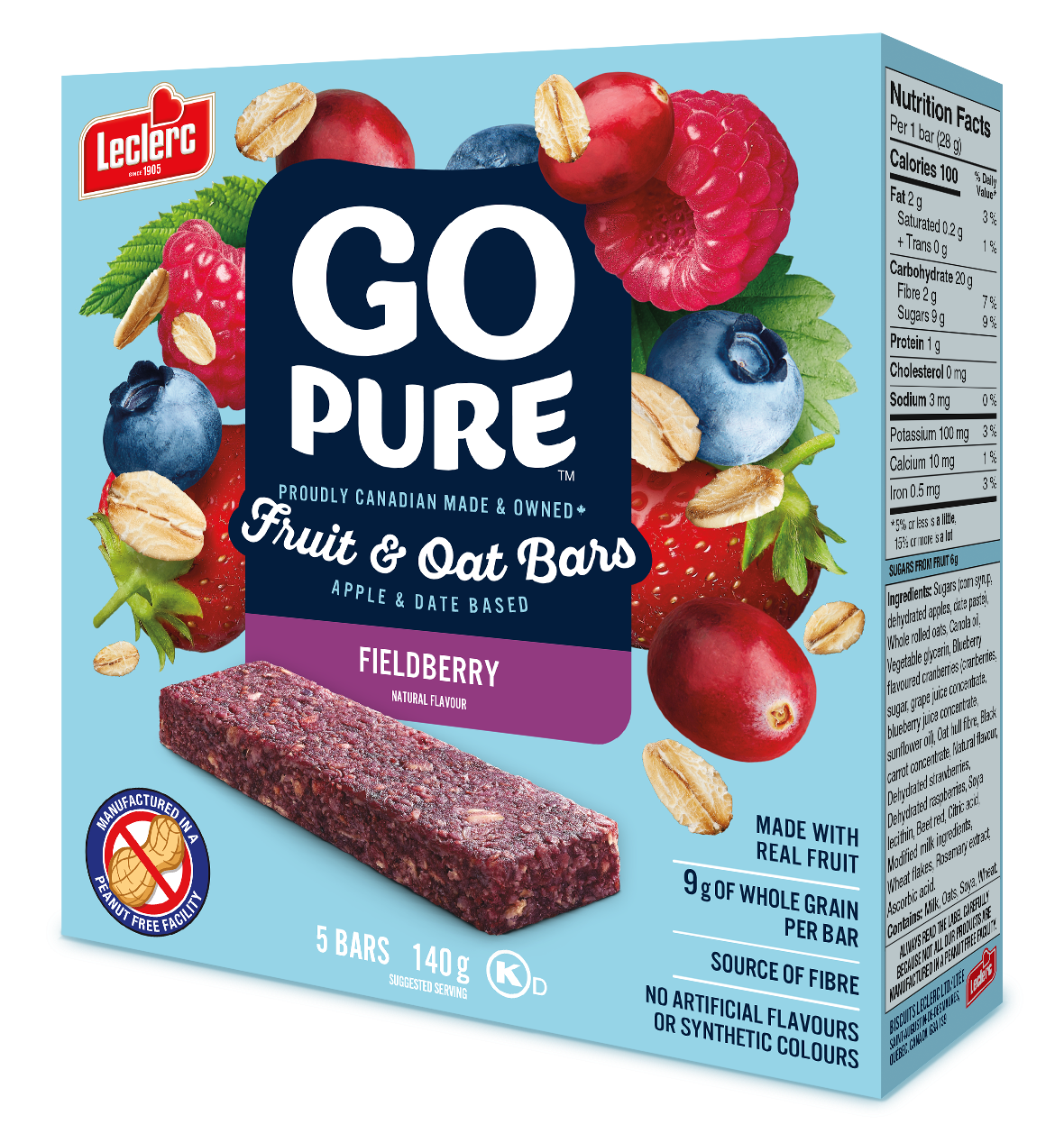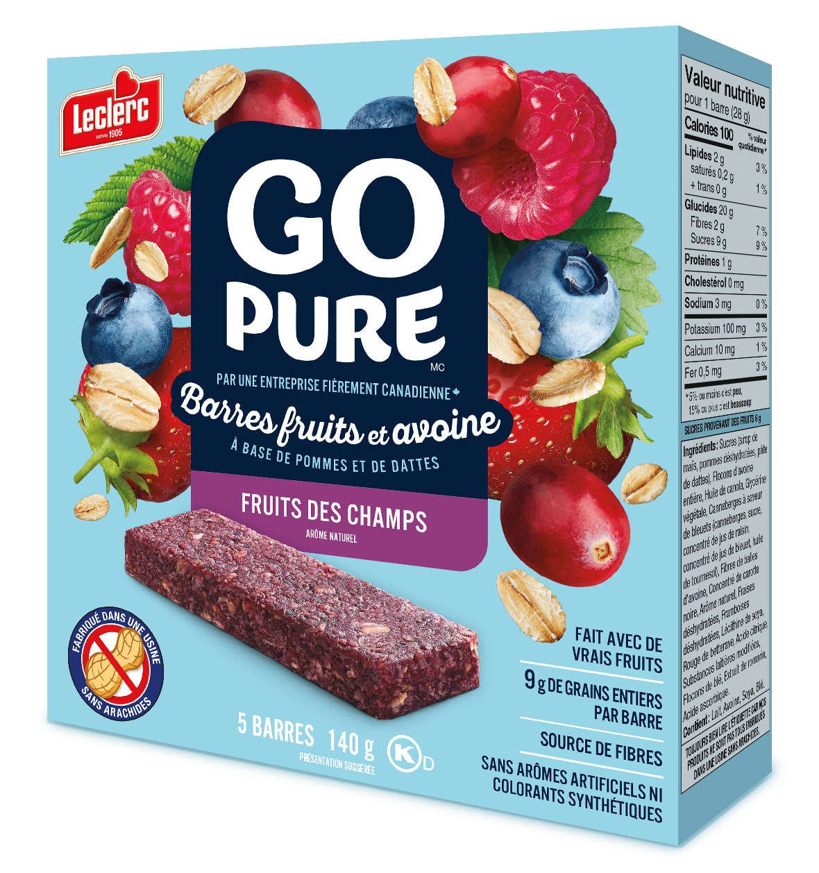 Sucres (sirop de maïs, pommes déshydratées, pâte de dattes), Flocons d'avoine entière, Huile de canola, Glycérine végétale, Canneberges à saveur de bleuets (canneberges, sucre, concentré de jus de raisin, concentré de jus de bleuet, huile de tournesol), Fibres de balles d'avoine, Concentré de carotte noire, Arôme naturel, Fraises déshydratées, Framboises déshydratées, Lécithine de soya, Rouge de betterave, Acide citrique, Substances laitières modifiées, Flocons de blé, Extrait de romarin, Acide ascorbique