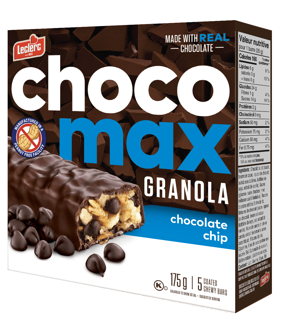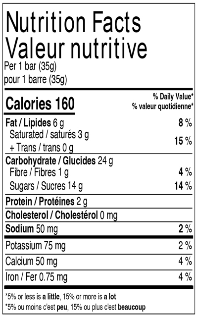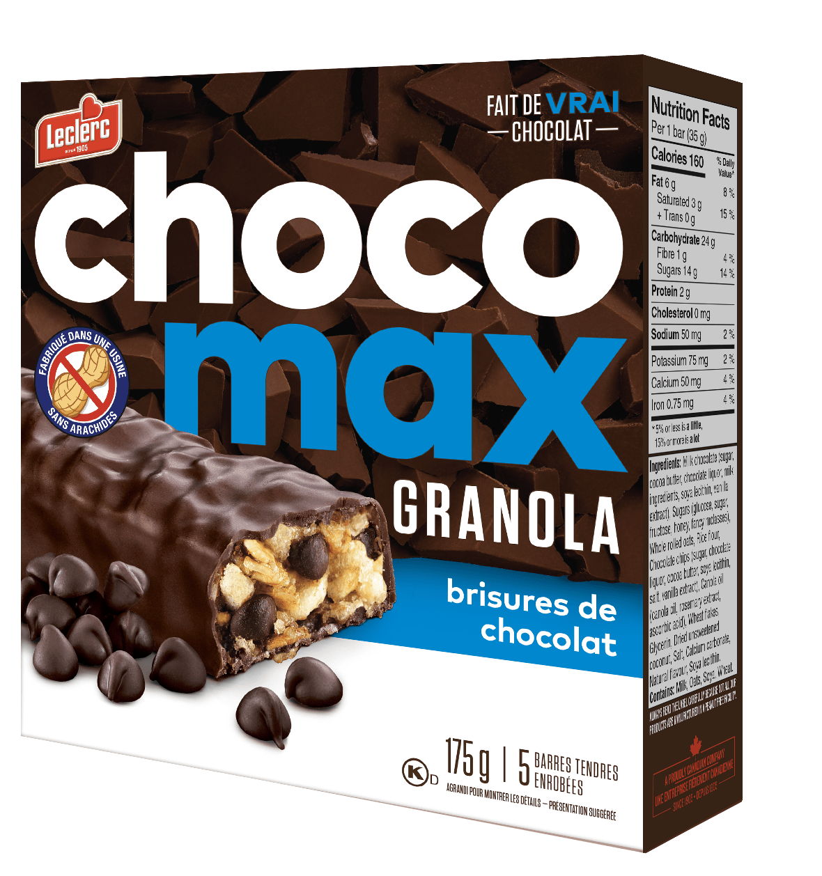 Chocolat au lait (sucre, beurre de cacao, liqueur de chocolat, substances laitières, lécithine de soya, extrait de vanille), Sucres (glucose, sucre, fructose, miel, mélasse qualité fantaisie), Flocons d'avoine entière, Farine de riz, Brisures de chocolat (sucre, liqueur de chocolat, beurre de cacao, lécithine de soya, sel, extrait de vanille), Huile de canola (huile de canola, extrait de romarin, acide ascorbique), Flocons de blé, Glycérine, Noix de coco séchée non sucrée, Sel, Carbonate de calcium, Arôme naturel, Lécithine de soya.