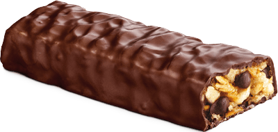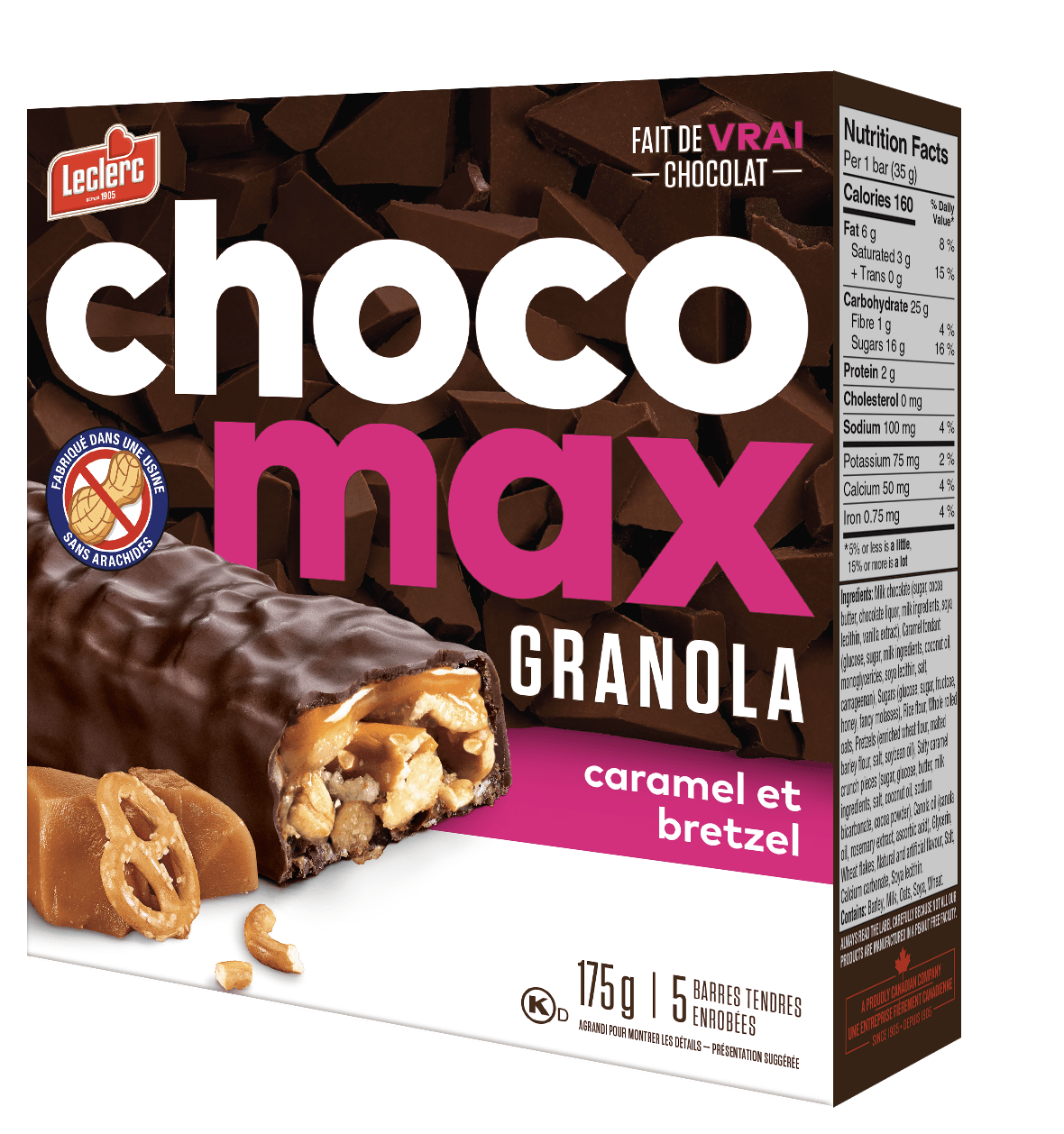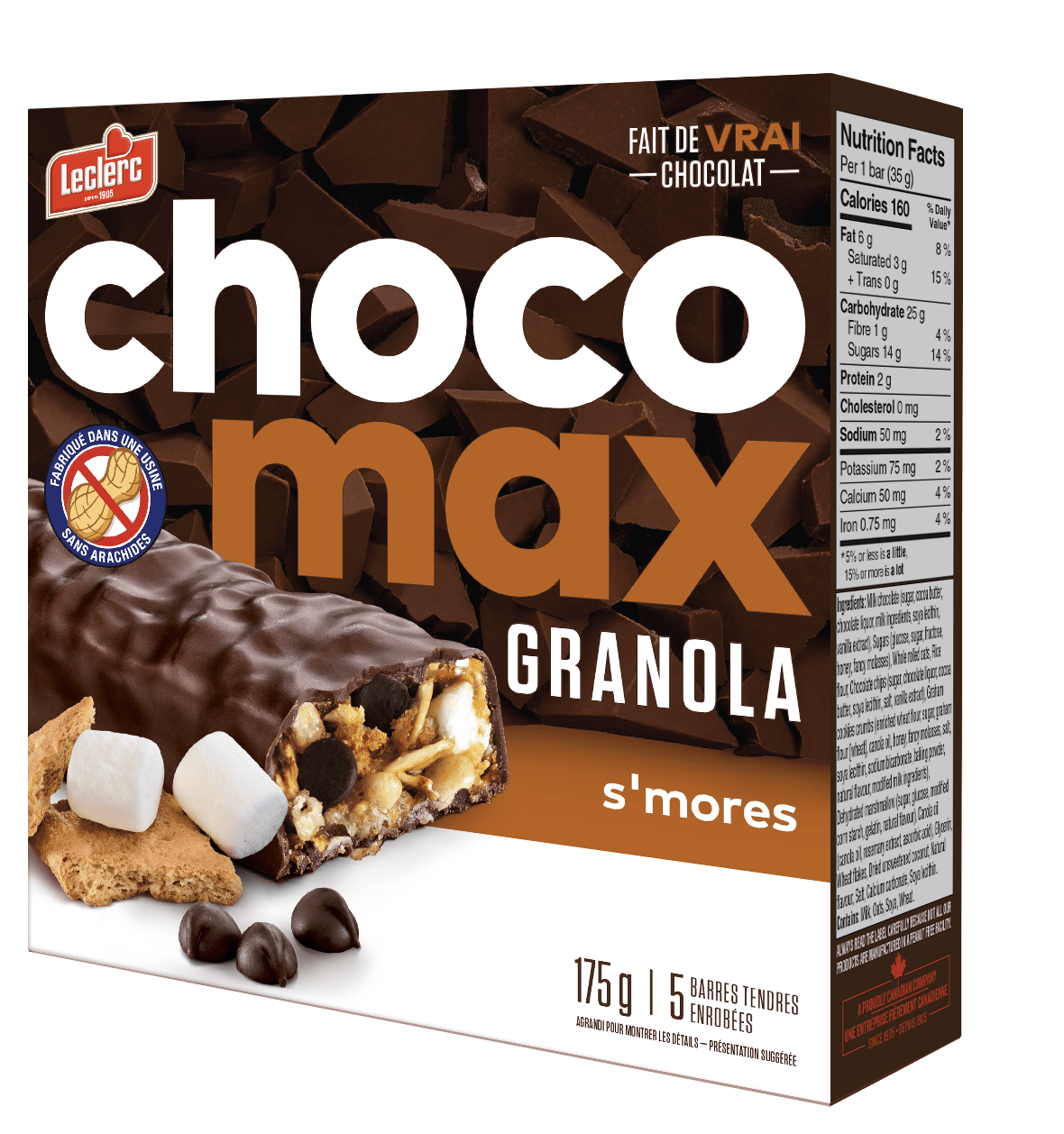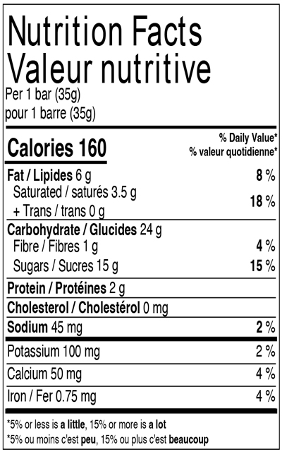 Chocolat au lait (sucre, beurre de cacao, liqueur de chocolat, substances laitières, lécithine de soya, extrait de vanille), Sucres (glucose, sucre, fructose, miel, mélasse qualité fantaisie), Fondant chocolaté au fudge (sucre, glucose, huile de noix de coco, poudre de cacao, substances laitières modifiées, eau, monoglycérides, lécithine de soya, extrait de vanille), Farine de riz, Flocons d'avoine entière, Huile de canola (huile de canola, extrait de romarin, acide ascorbique), Brisures de chocolat (sucre, liqueur de chocolat, beurre de cacao, lécithine de soya, sel, extrait de vanille), Glycérine, Poudre de cacao, Flocons de blé, Carbonate de calcium, Sel, Arôme artificiel, Lécithine de soya.