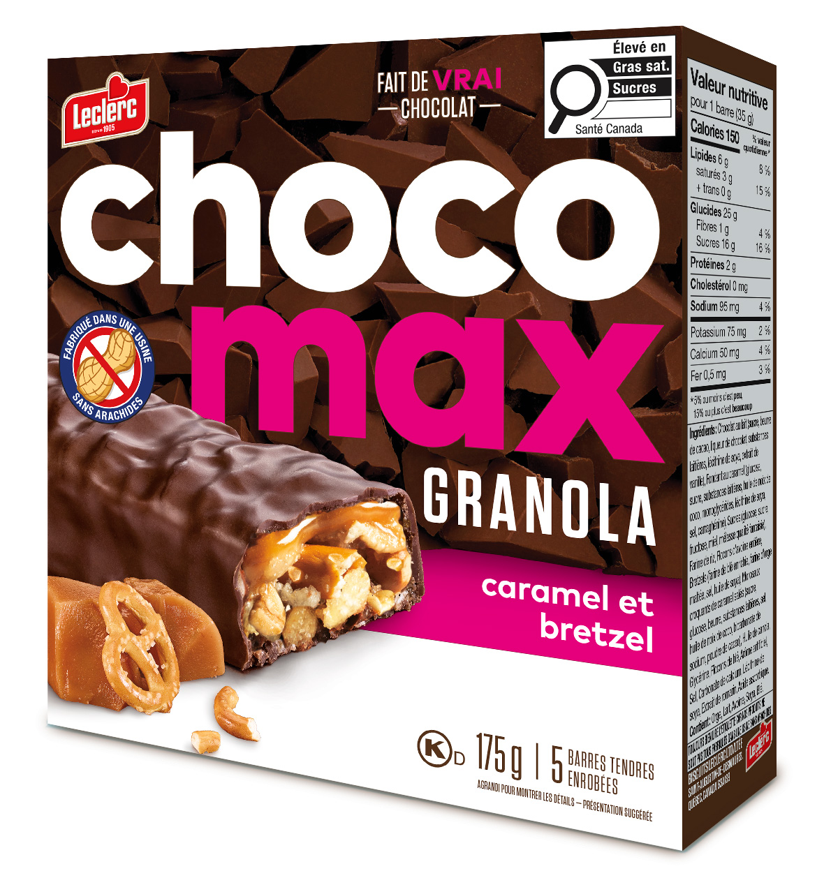 Barres enrobées de vrai chocolat. Le mix parfait de granola, de caramel et de bretzel pour satisfaire ce petit creux peu importe l'heure de la journée. En plus, elles sont certifiées sans arachides!
