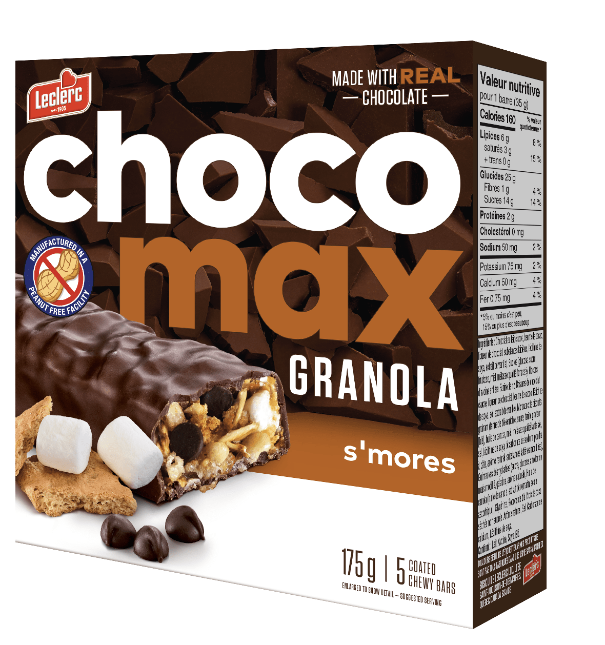 Chocolat au lait (sucre, beurre de cacao, liqueur de chocolat, substances laitières, lécithine de soya, extrait de vanille), Sucres (glucose, sucre, fructose, miel, mélasse qualité fantaisie), Flocons d'avoine entière, Farine de riz, Brisures de chocolat (sucre, liqueur de chocolat, beurre de cacao, lécithine de soya, sel, extrait de vanille), Morceaux de biscuits graham (farine de blé enrichie, sucre, farine graham [blé], huile de canola, miel, mélasse qualité fantaisie, sel, lécithine de soya, bicarbonate de sodium, poudre à pâte, arôme naturel, substances laitières modifiées), Guimauves déshydratées (sucre, glucose, amidon de maïs modifié, gélatine, arôme naturel), Huile de canola (huile de canola, extrait de romarin, acide ascorbique), Glycérine, Flocons de blé, Noix de coco séchée non sucrée, Arôme naturel, Sel, Carbonate de calcium, Lécithine de soya.