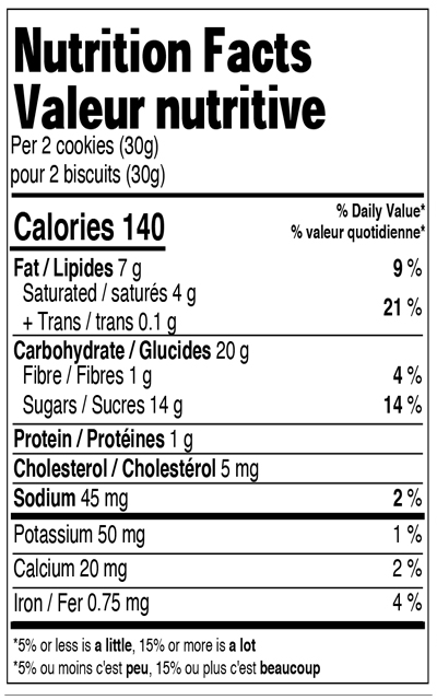 Chocolat au lait (sucre, beurre de cacao, liqueur de chocolat, substances laitières, lécithine de soya, vanilline), Farine de blé enrichie, Garniture arômatisée à la fraise et crème (glucose, sucre, huile de noix de coco, eau, substances laitières modifiées, monoglycérides, bioxyde de titane, arôme naturel, sel, lécithine de soya, rouge allura), Sucre, Beurre (lait), Sel, Bicarbonate de sodium, Lécithine de soya, Arôme artificiel.