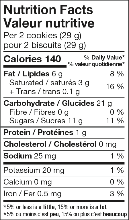 Biscuit (farine de blé enrichie, sucre, huile de palme, huile de canola, substances laitières, bicarbonate de sodium, arôme naturel, lécithine de soya, carotène), Crème (sucre, huiles de palme et de palmiste modifiées, amidon de blé, arôme naturel, lécithine de soya, sel), Garniture aux framboises (glucose, sucre, eau, glycérine, fructose, purée de framboises, pectine, citrate de sodium, arôme naturel, acide citrique, concentré de carotte et de cassis).