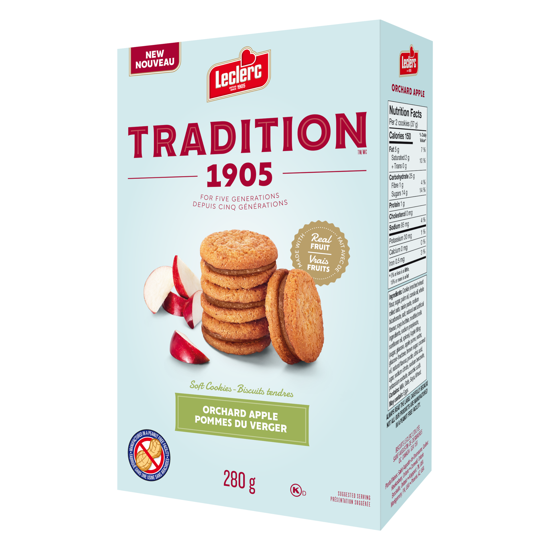 Biscuit (farine de blé enrichie, sucre, huile de canola, mono et diglycérides, mélasse qualité fantaisie, bicarbonate de sodium, sel, lécithine de soya, arôme naturel, substances laitières modifiées, tartrazine et jaune soleil fcf et rouge allura), Garniture aux pommes (purée de pommes, glucose, sucre, glucose-fructose, pectine, acide citrique, sorbate de potassium, rouge allura). Contient : Lait, Soya, Blé.