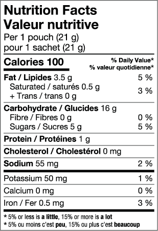 Farine de blé enrichie, Sucre, Huile de canola, Mono et diglycérides, Sel, Bicarbonate de potassium, Arôme naturel, Tocophérols, Lécithine de soya, Substances laitières modifiées. Contient : Lait, Soya, Blé.