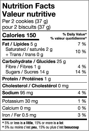 Biscuit (farine de blé enrichie, sucre, huile de palme, huile de canola, flocons d'avoine entière, pâte de raisins secs [raisins secs, huile de tournesol], bicarbonate de sodium, sel, arôme naturel et artificiel, lécithine de soya, substances laitières modifiées, propionate de sodium, épices), Garniture aux fruits des champs (sucre, glucose, purée de fruits des champs [fraises, bleuets, framboises], eau, glucose-fructose, huile de noix de coco, pectine, acide citrique, arôme naturel, concentré de carotte noire [concentré de carotte noire, acide citrique], agar-agar, citrate de sodium, benzoate de sodium, sorbate de potassium).