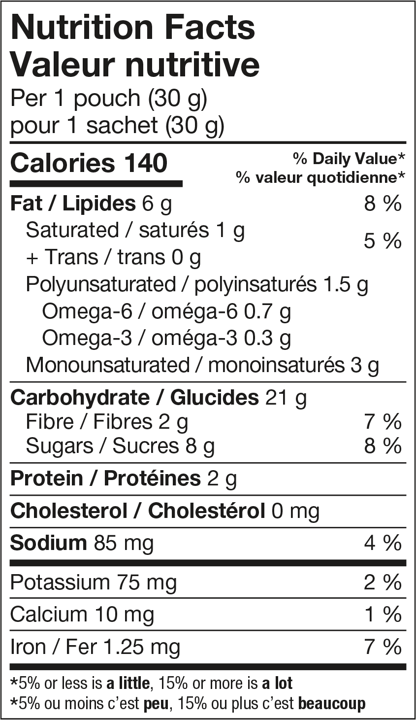 Mélange d'avoine (flocons d'avoine entière, farine d'avoine entière), Cassonade, Farine de blé enrichie, Huile de canola, Brisures de chocolat noir (liqueur de chocolat, sucre, dextrose, lécithine de soya, extrait de vanille), Fibres de balles d'avoine, Arôme naturel, Graines de chia moulues, Sel, Bicarbonate de sodium, Substances laitières modifiées. Contient : Lait, Avoine, Soya, Blé.