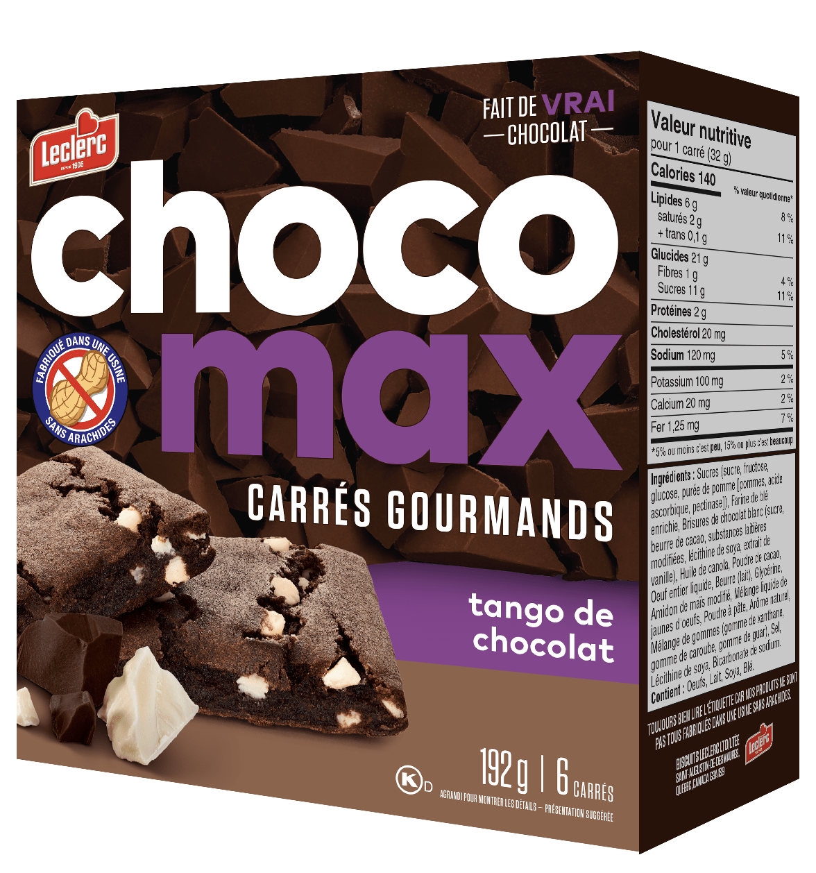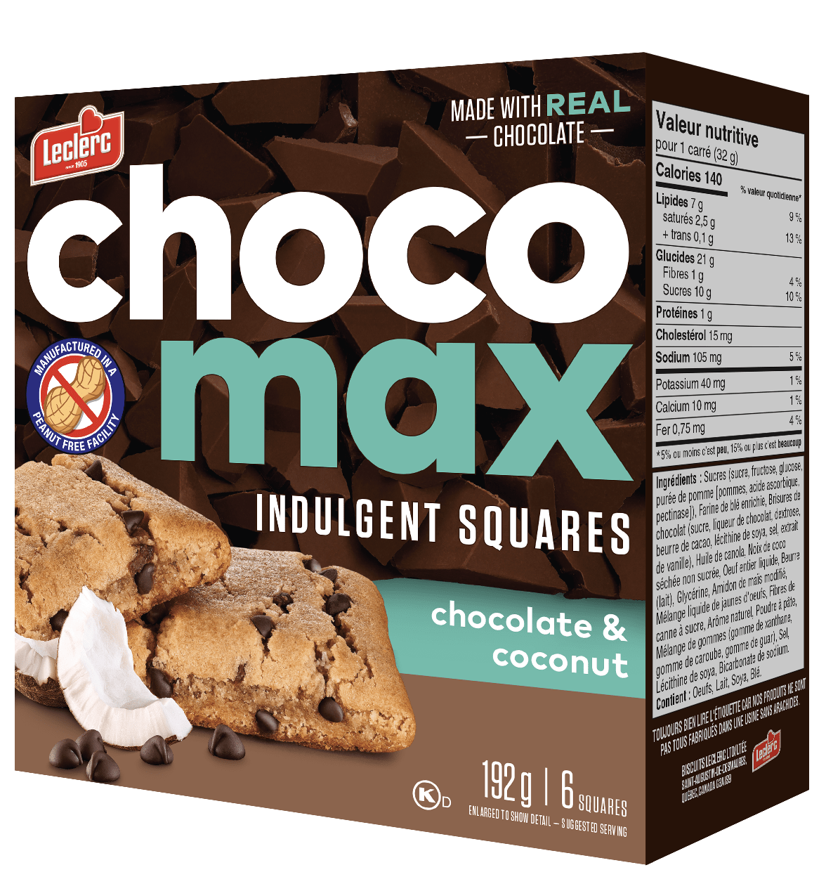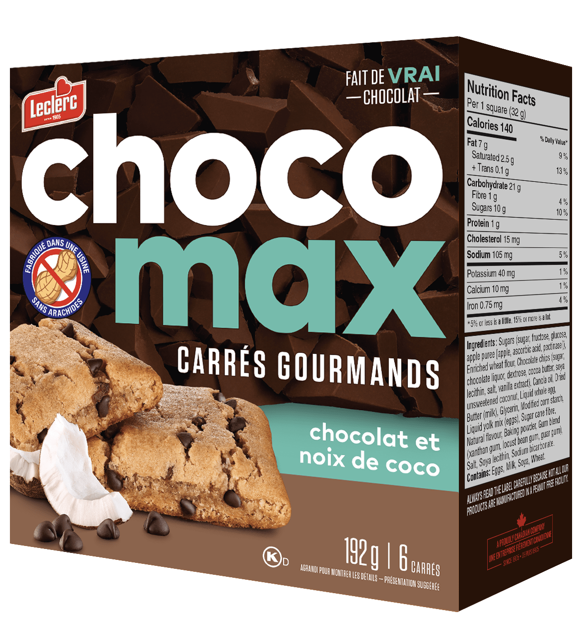 Sucres (sucre, fructose, glucose, purée de pomme [pommes, acide ascorbique, pectinase]), Farine de blé enrichie, Brisures de chocolat (sucre, liqueur de chocolat, dextrose, beurre de cacao, lécithine de soya, sel, extrait de vanille), Huile de canola, Noix de coco séchée non sucrée, Oeuf entier liquide, Beurre (lait), Glycérine, Amidon de maïs modifié, Mélange liquide de jaunes d'oeufs, Fibres de canne à sucre, Arôme naturel, Poudre à pâte, Mélange de gommes (gomme de xanthane, gomme de caroube, gomme de guar), Sel, Lécithine de soya, Bicarbonate de sodium.